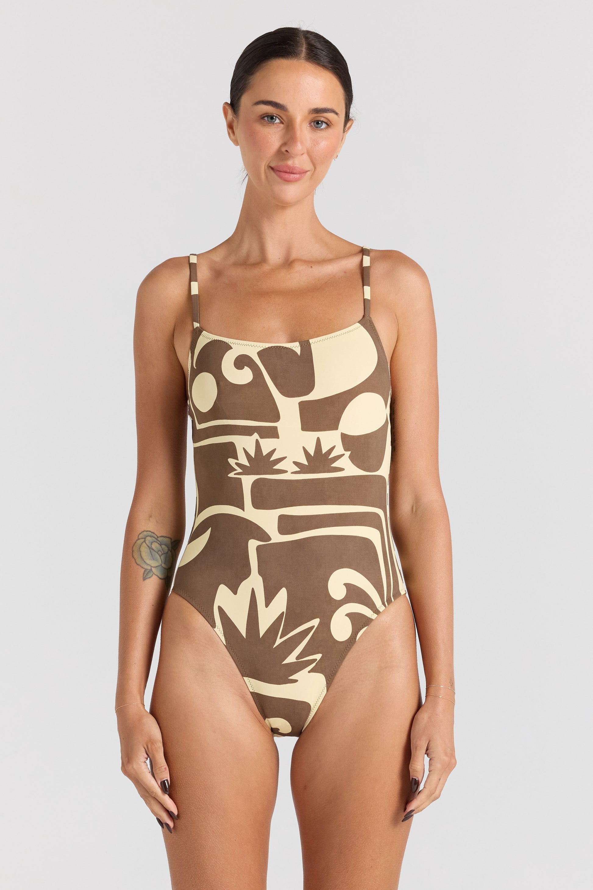 The Beachcomber Singlet One Piece blends clean, modern lines with vintage tropical energy. Crafted in the signature Beachcomber geo graphic print, the banana and chocolate colourway feels sun-warmed and nostalgic with a contemporary edge. Designed with a streamlined singlet silhouette, this one piece features an internal shelf bra for light support and all-day comfort. With its effortless fit and timeless appeal, it’s a versatile swim style made for beach days, poolside lounging, and relaxed holiday moments.