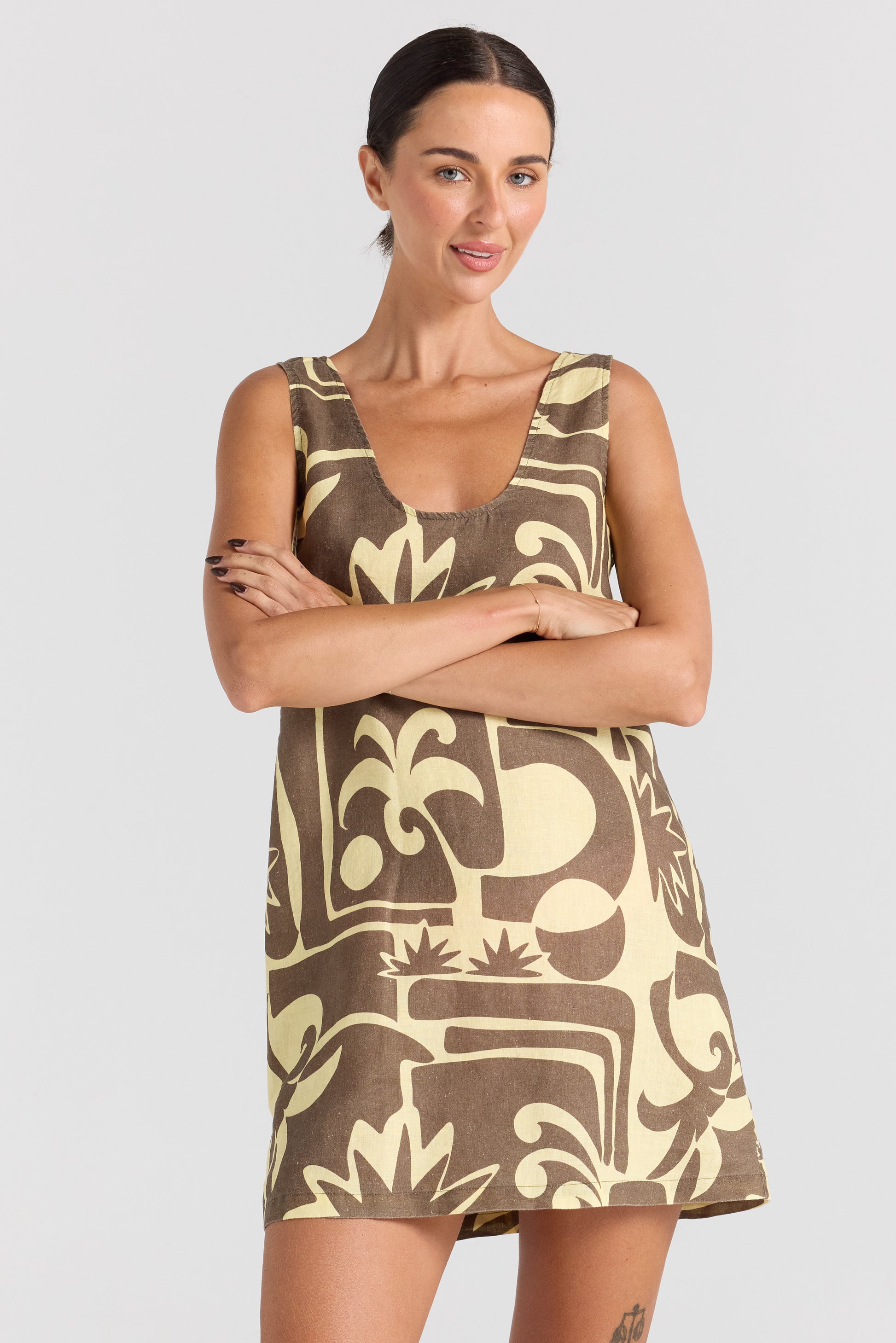 The Beachcomber U Shift Dress captures effortless summer dressing with a nostalgic tropical twist. Crafted from 100% linen, this easy shift silhouette is lightweight, breathable, and designed for warm-weather days. Featuring a soft U neckline and relaxed fit, it’s finished in the Beachcomber geo graphic print in banana and chocolate tones—evoking sun-faded island charm with a modern edge. Easy to slip on and endlessly wearable, this dress moves seamlessly from beach mornings to sunset strolls.