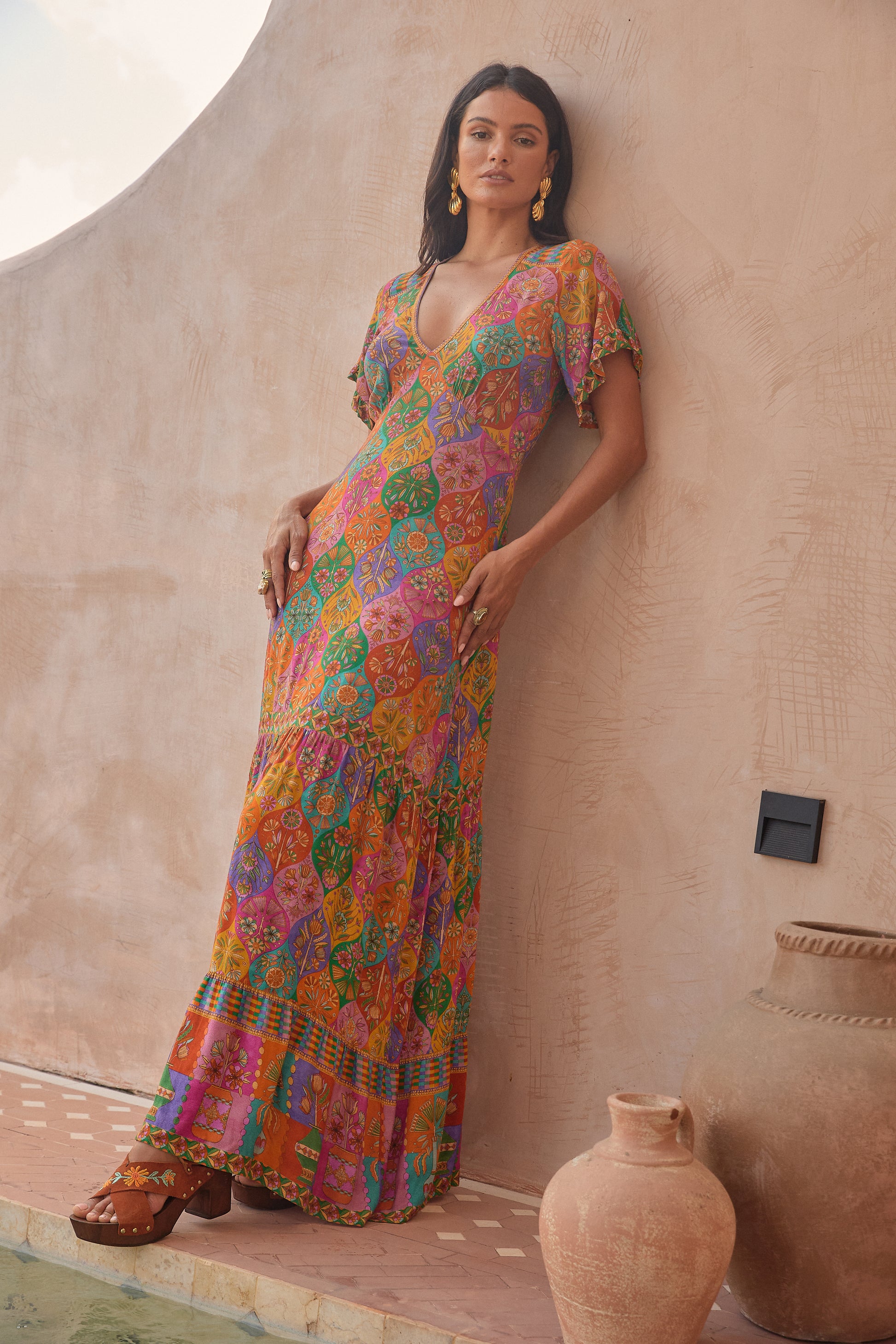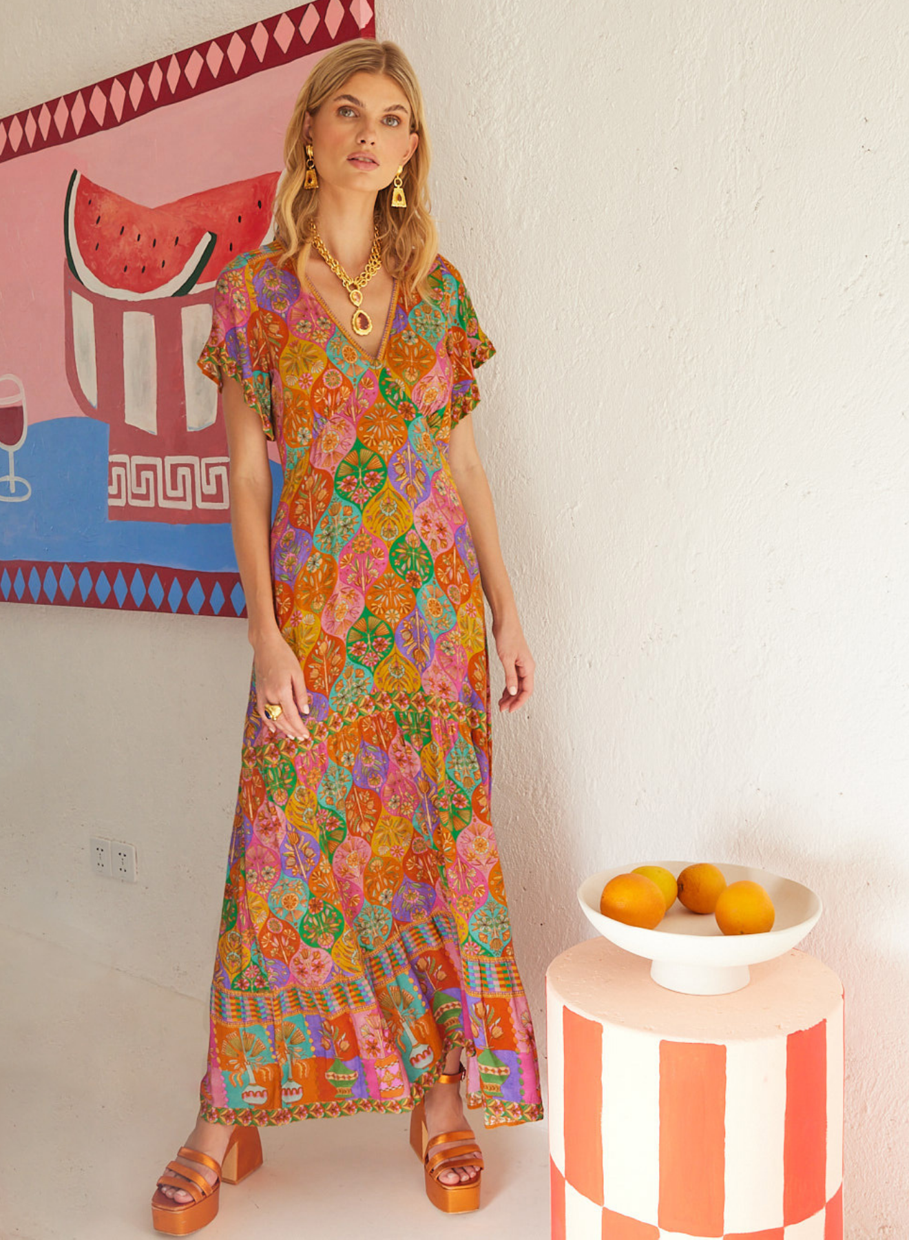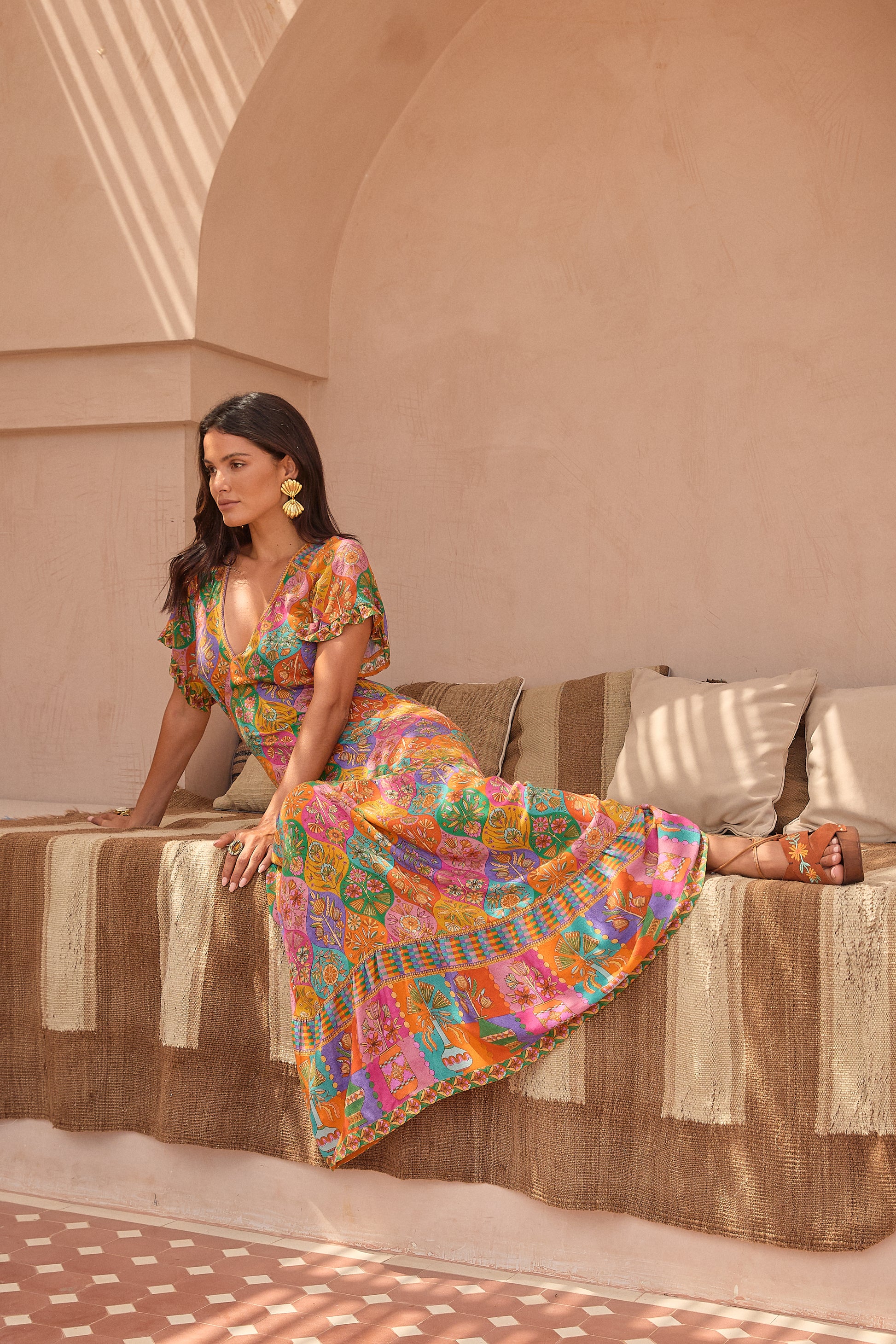 Introducing our enchanting Delilah dress, your new go-to for unforgettable moments. Adorned with a vibrant, Moroccan-inspired floral tile print, this gown features detailed print placement and a playful yet elegant short frilled sleeve. Whether you’re attending a garden party or a formal soirée, Delilah is perfect for making a statement and turning heads.