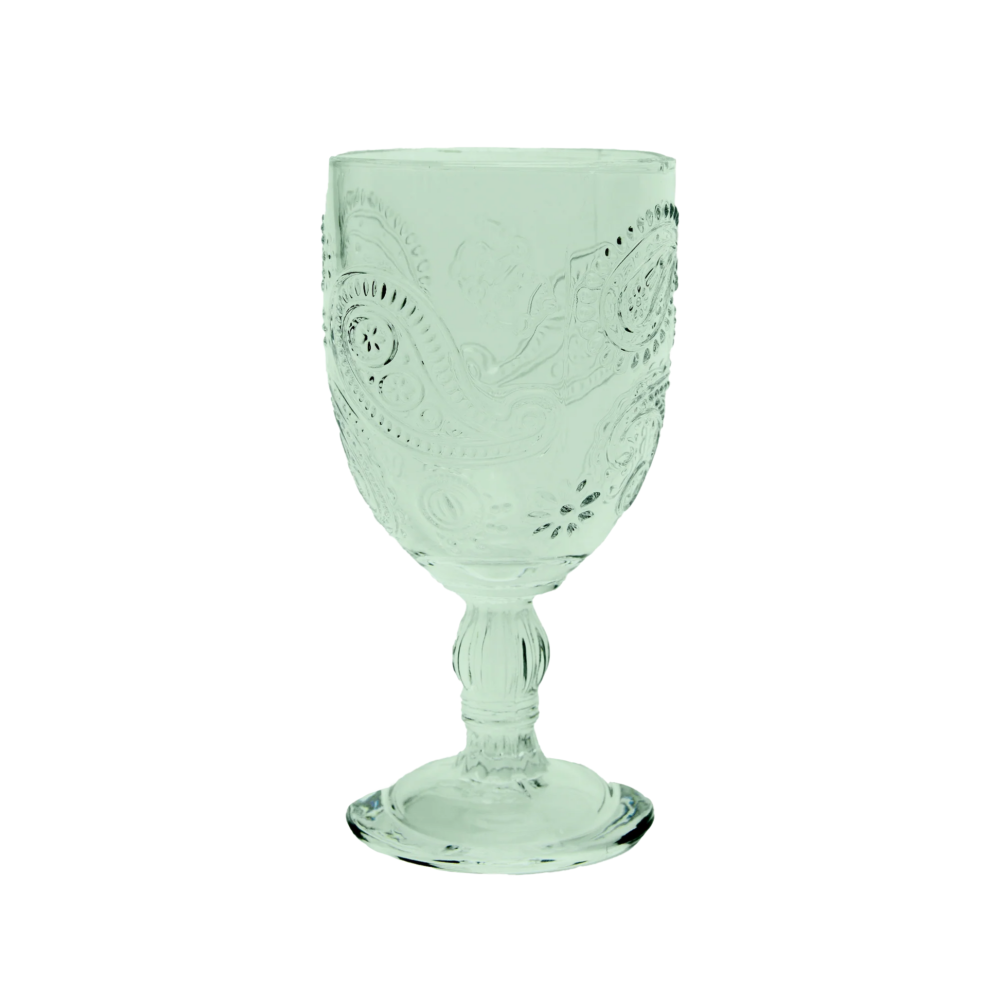 Our stunning Goblet glass set of two featured in this fabulous new Peppermint colour way are made from a durable, thick glass that features a beautiful embossed design.