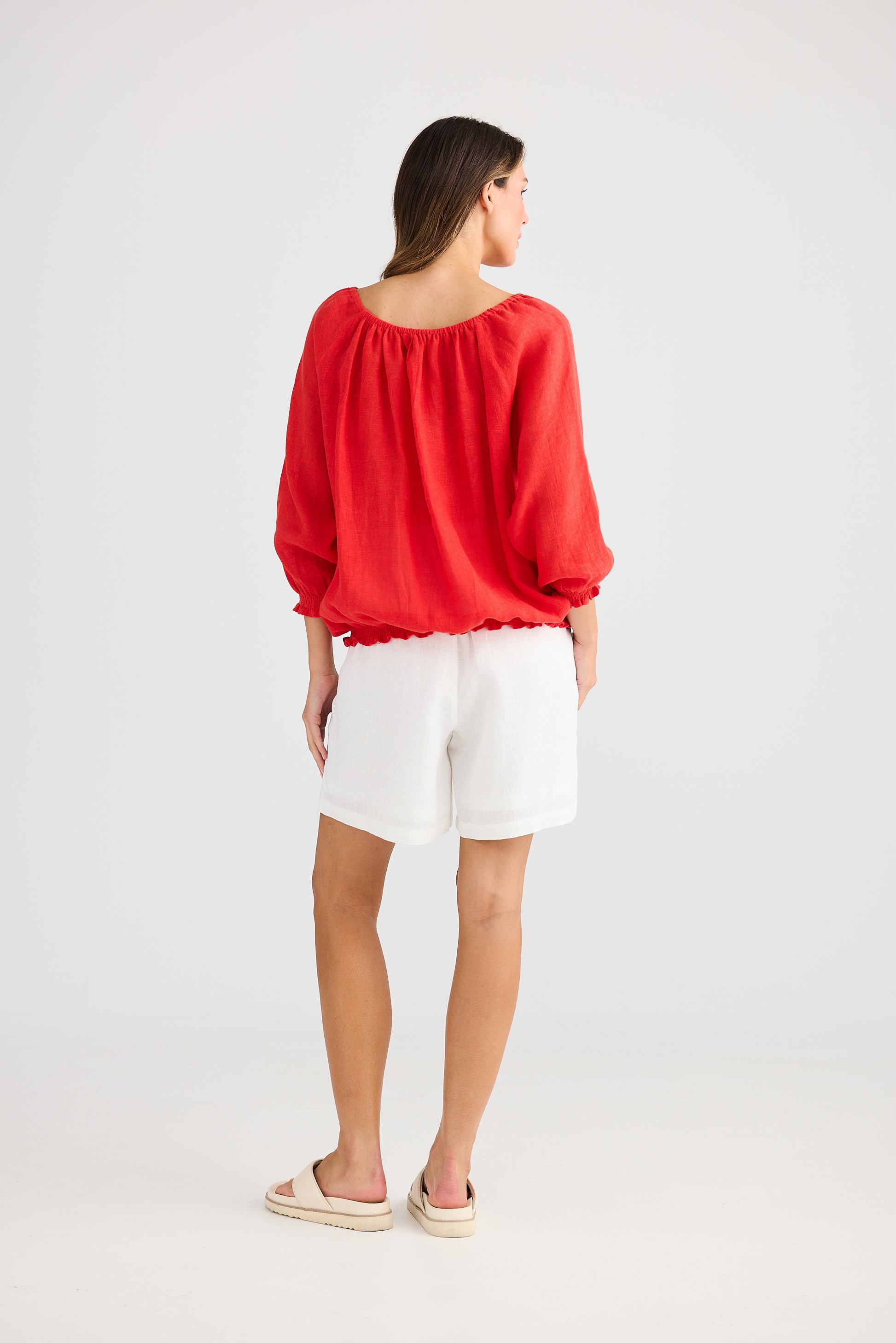 Neck ties with tassels Full length raglan sleeves Featured shirring on cuffs and waistband Breathable linen gauze fabrication |